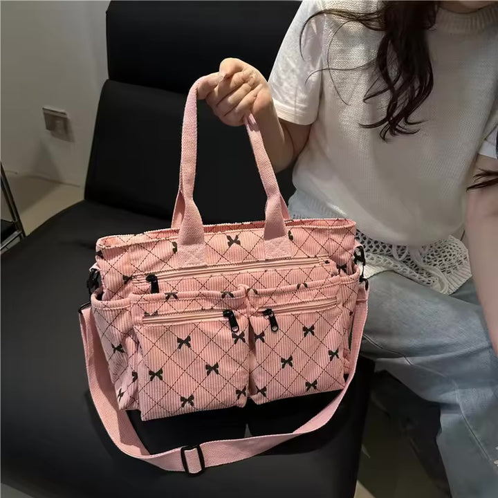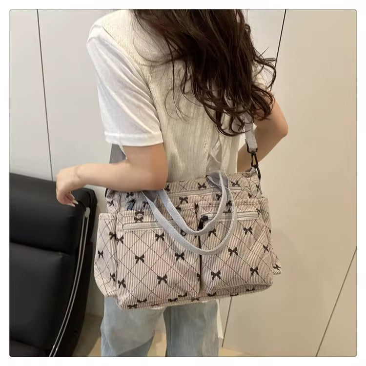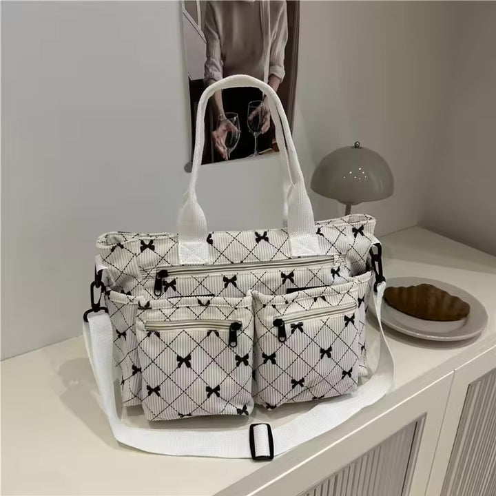Structured yet soft, The Bowline Utility Tote blends functional charm with modern elegance. Crafted in a durable canvas fabric, its all-over bow pattern and multiple zip compartments make it perfect for on-the-go days. Whether styled with streetwear or casual neutrals, it brings quiet statement energy to any look.