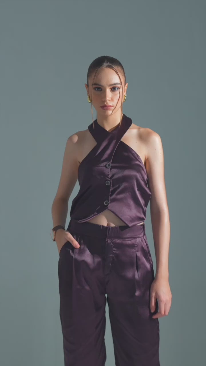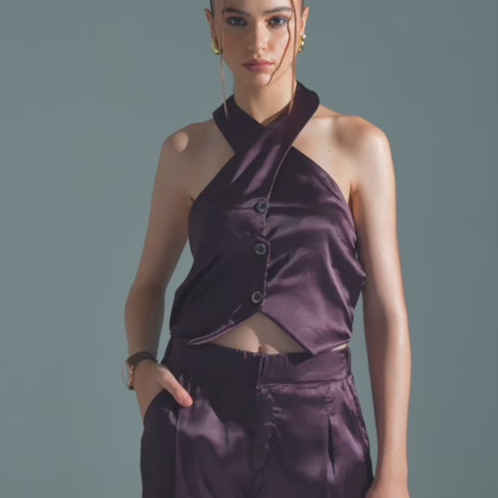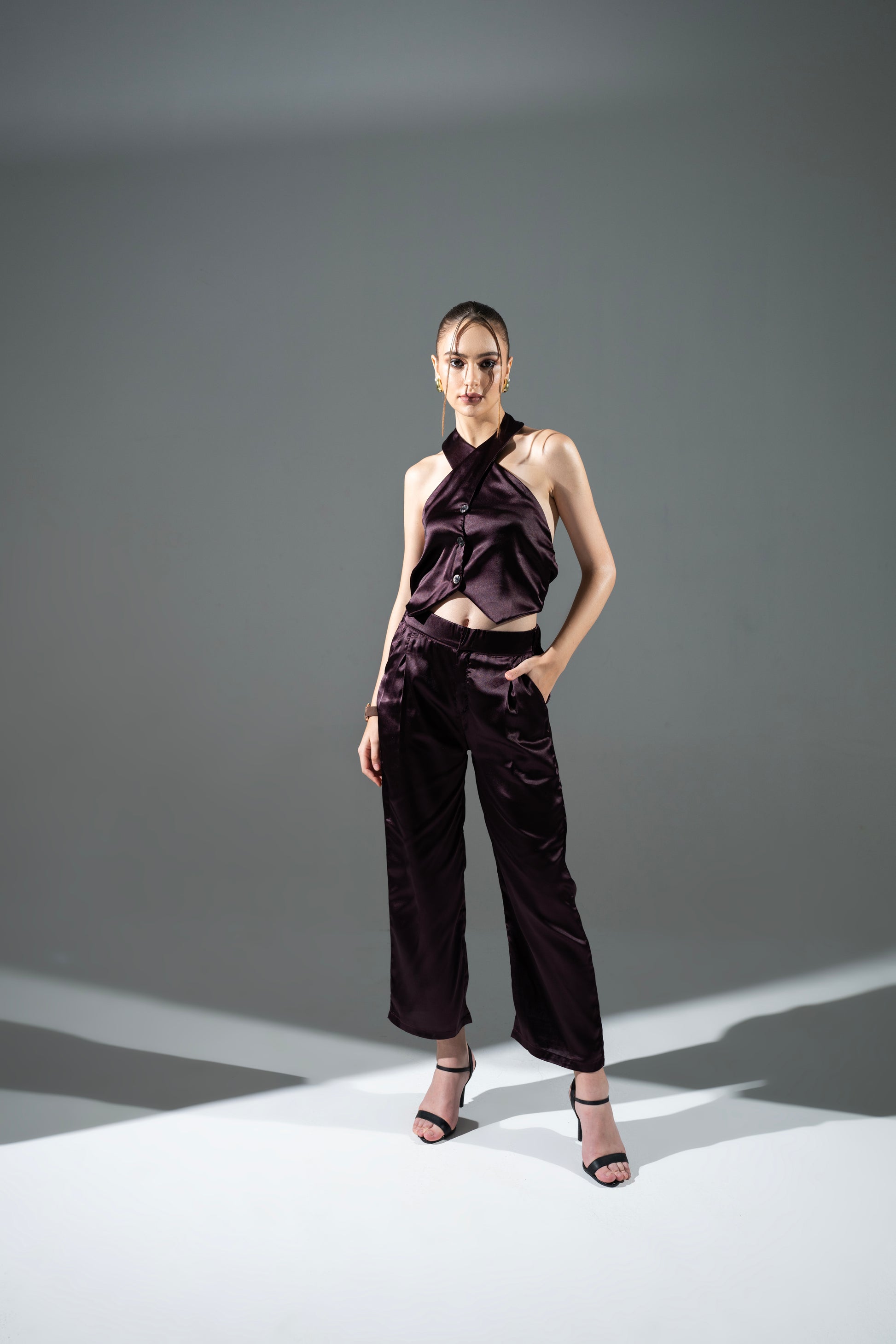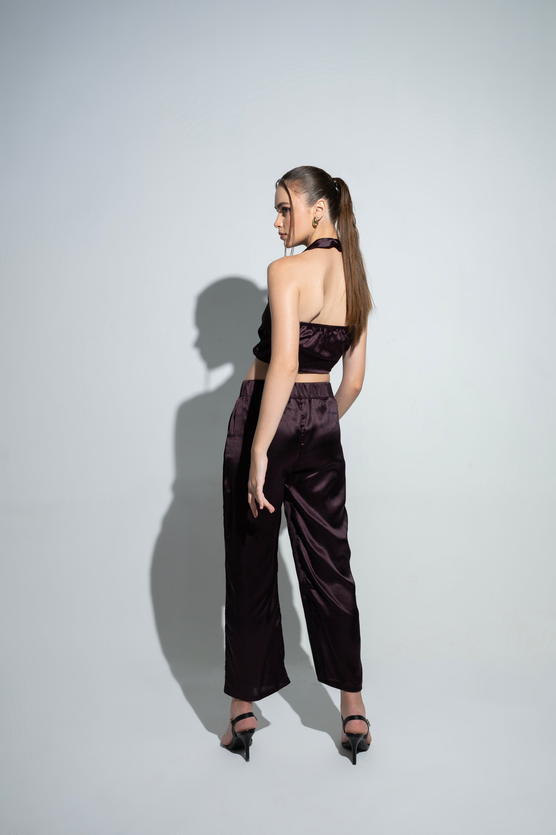 Backless Cross Neck Satin Co-ord Set ( Brown )